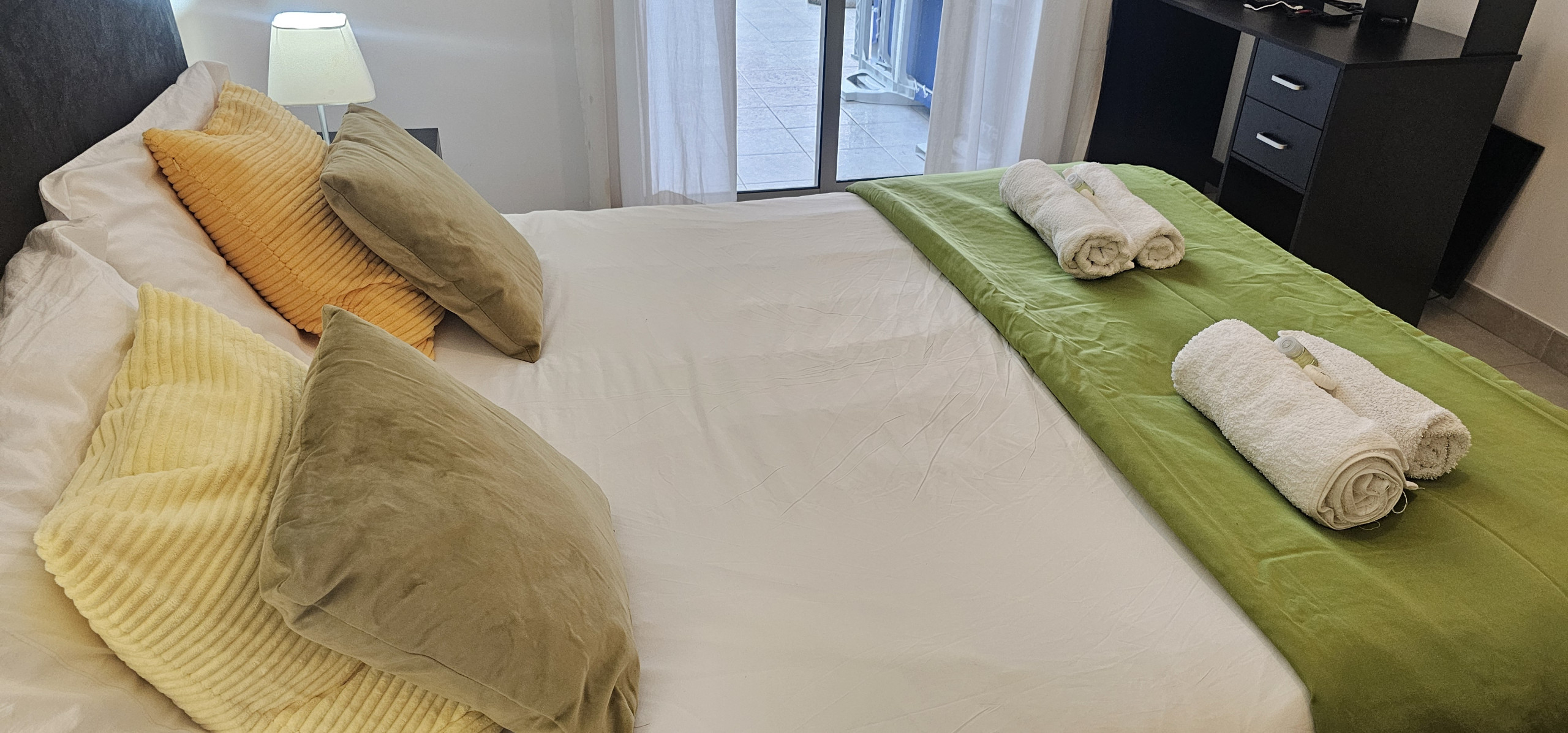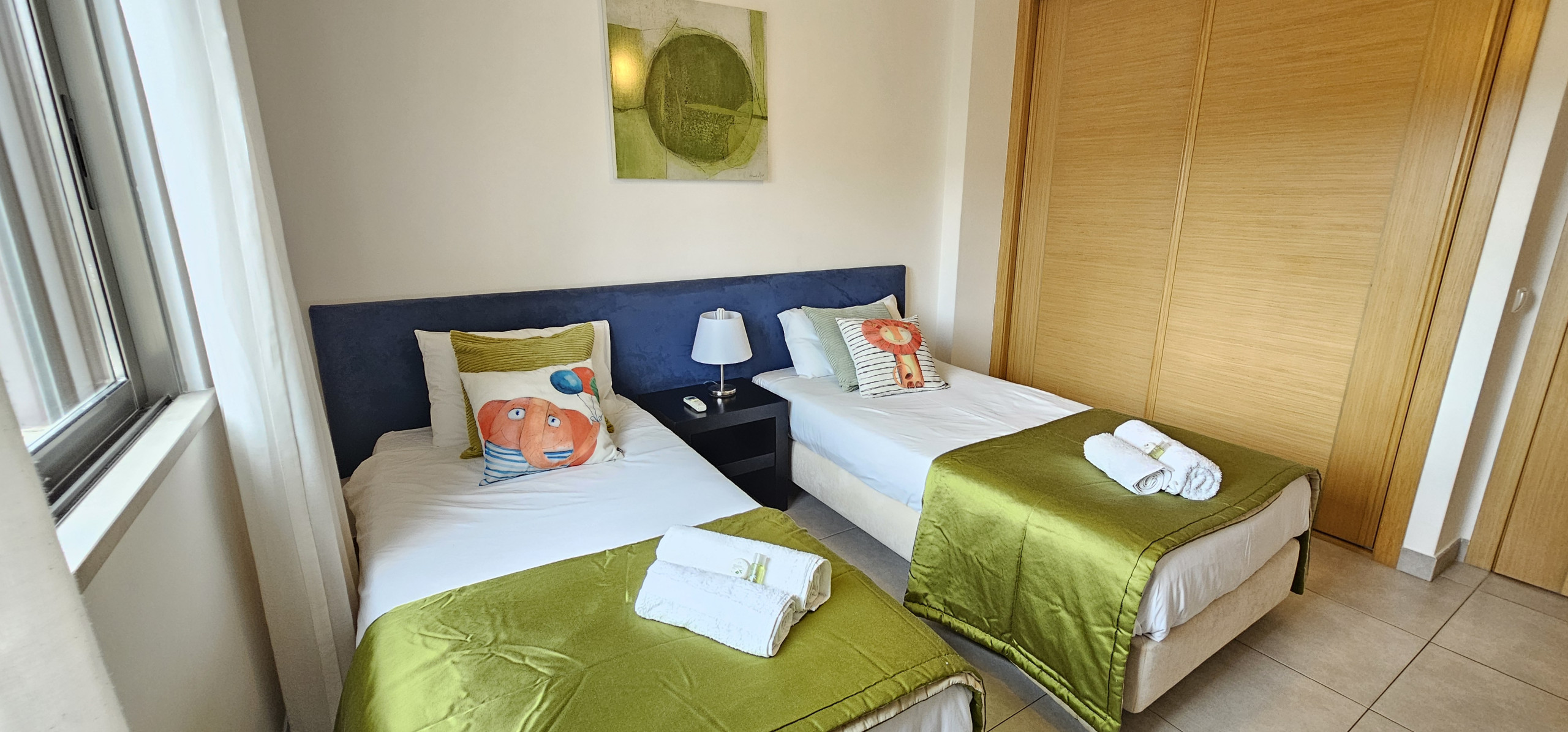 O apartamento é composto por dois quartos – um com cama de casal e outro com duas camas individuais – uma cozinha totalmente equipada, uma sala de estar ampla e uma excelente varanda com vista para a piscina, perfeita para desfrutar de refeições em família ao ar livre.