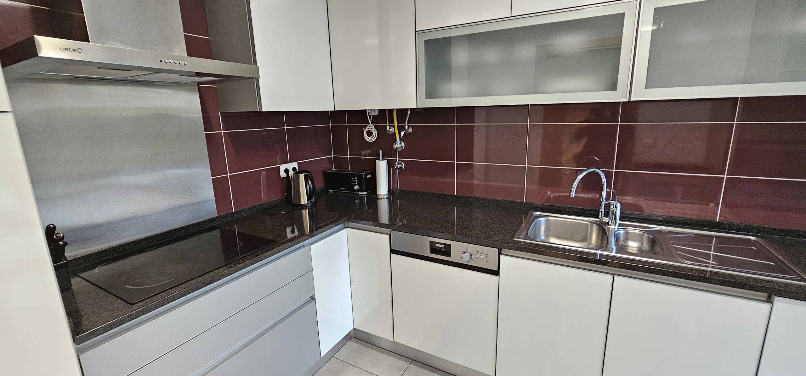 the kitchen, refrigerator, microwave, oven, dishwasher, dishes/cutlery, kitchen utensils, frying pan, toaster and kettle are provided.