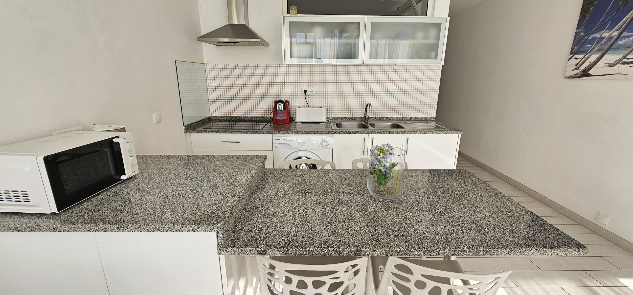 La cuisine, est équipée avec réfrigérateur, micro-ondes, congélateur, ustensiles/cuisine, cafetière, friteuse, grille pain et bouilloire.
